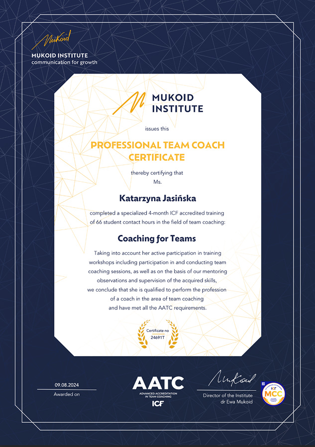 I am also a graduate of the Advanced Coaching Studies at the Mukoid Institute, the accredited Team Coaching course at the Mukoid Institute, and courses conducted by Team Coaching International.