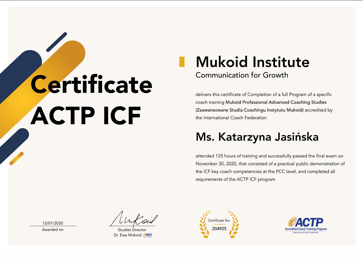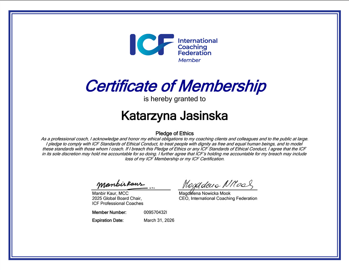 I am an accredited Coach with the International Coaching Federation (ICF) at the PCC level, a Gallup® Certified Strengths Coach, and a certified assessor (EY Academy of Business) in competency diagnosis using Assessment Center & Development Center methods.