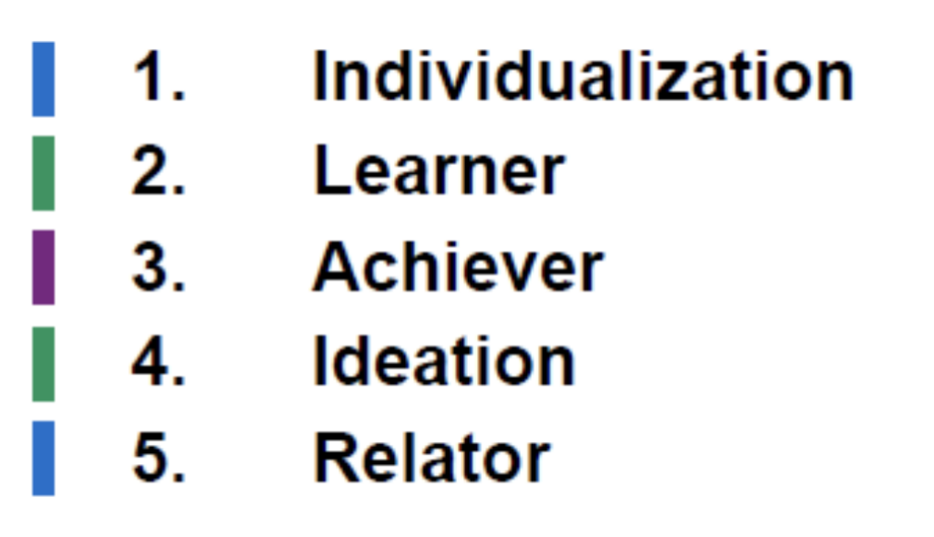 My Relationship Building talents help me recognize the uniqueness of others and situations, adapt, follow and support others, and be a true partner in collaboration.