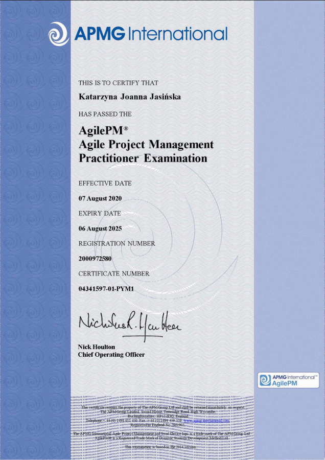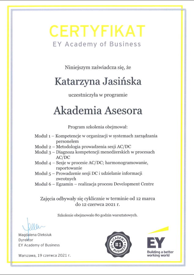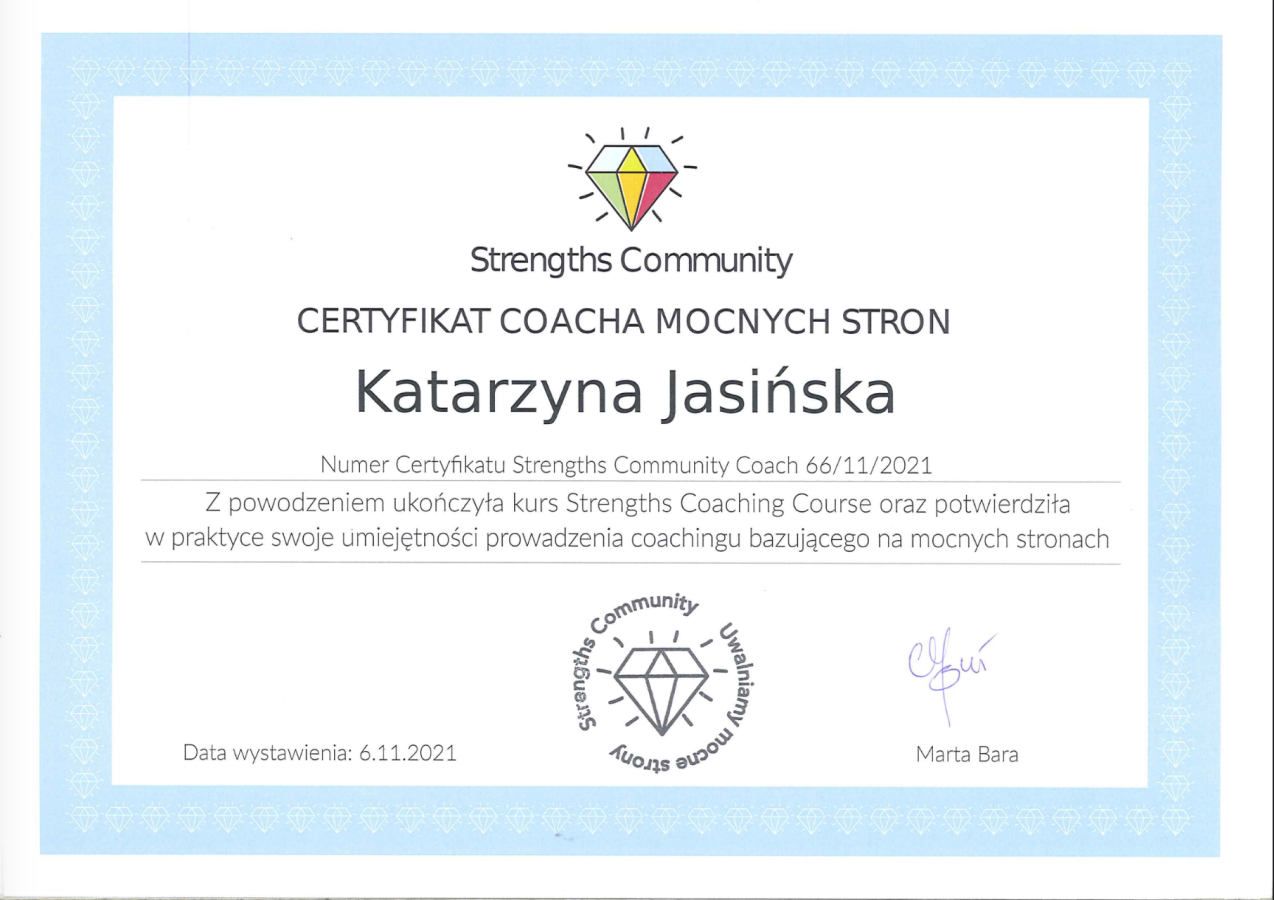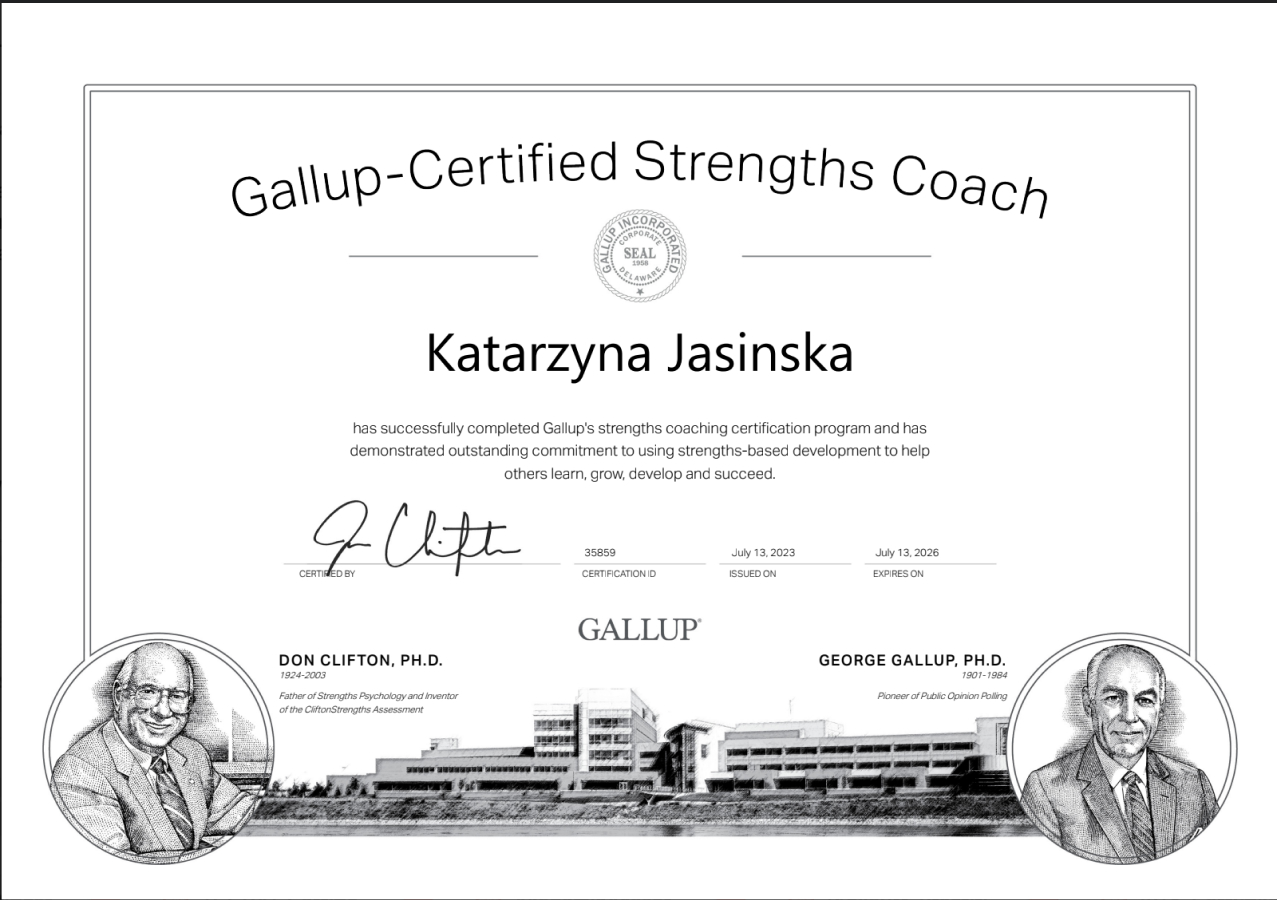 Jestem akredytowanym Coachem International Coaching Federation (ICF) na poziomie PCC, certyfikowanym Coachem Gallupa (Gallup® Certified Strengths Coach) oraz certyfikowanym asesorem (EY Academy of Business) diagnozowania kompetencji metodami Assessment Center & Development Center.