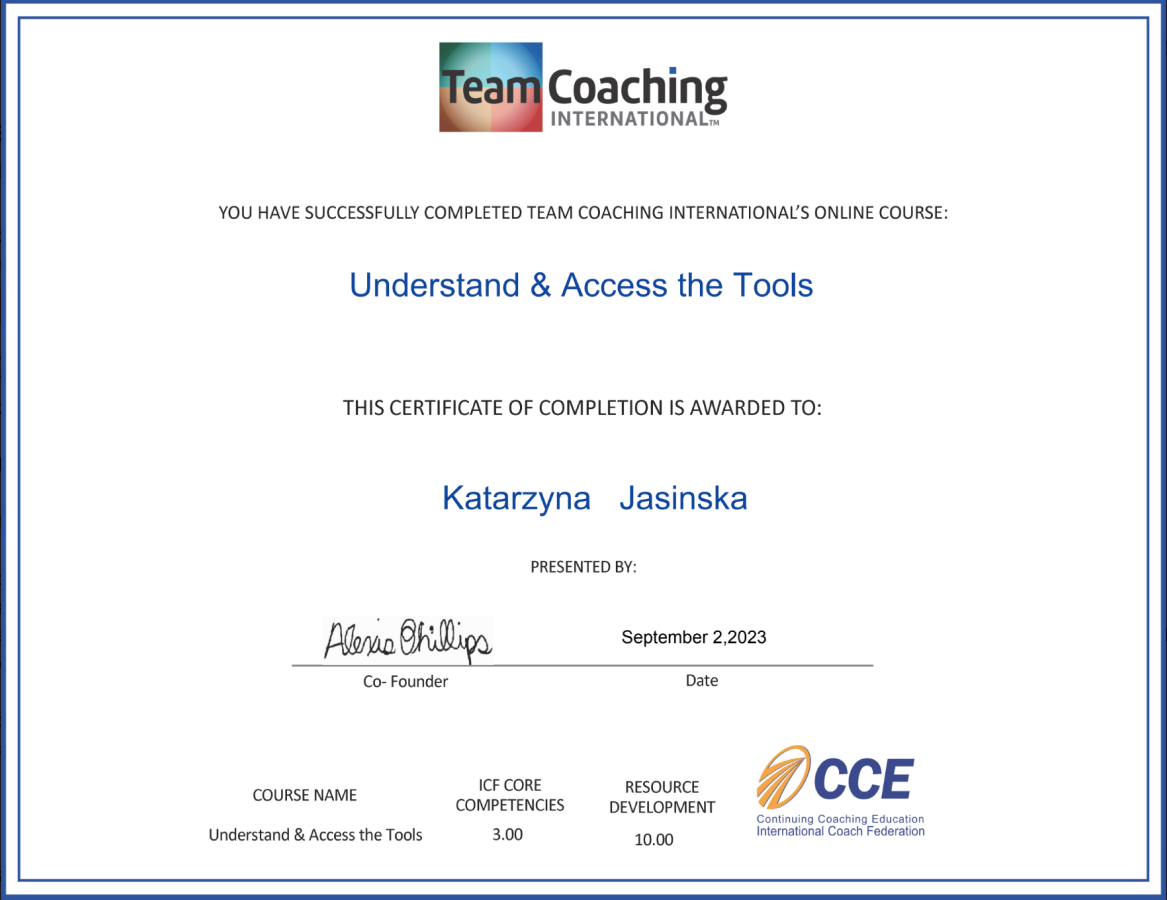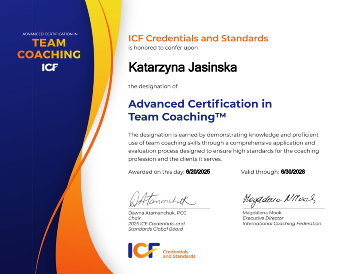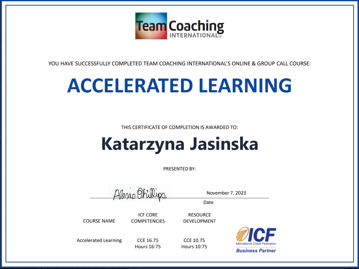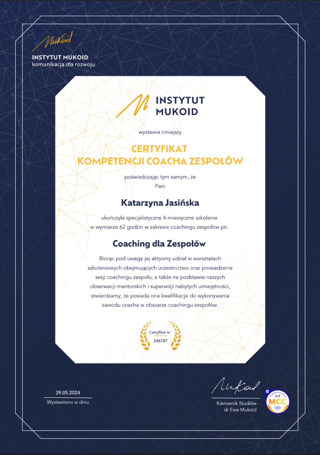 Jestem również absolwentką Zaawansowanych Studiów Coachingu Instytutu Mukoid, akredytowanego kursu Team Coachingu Instytutu Mukoid oraz kursów realizowanych przez Team Coaching International.